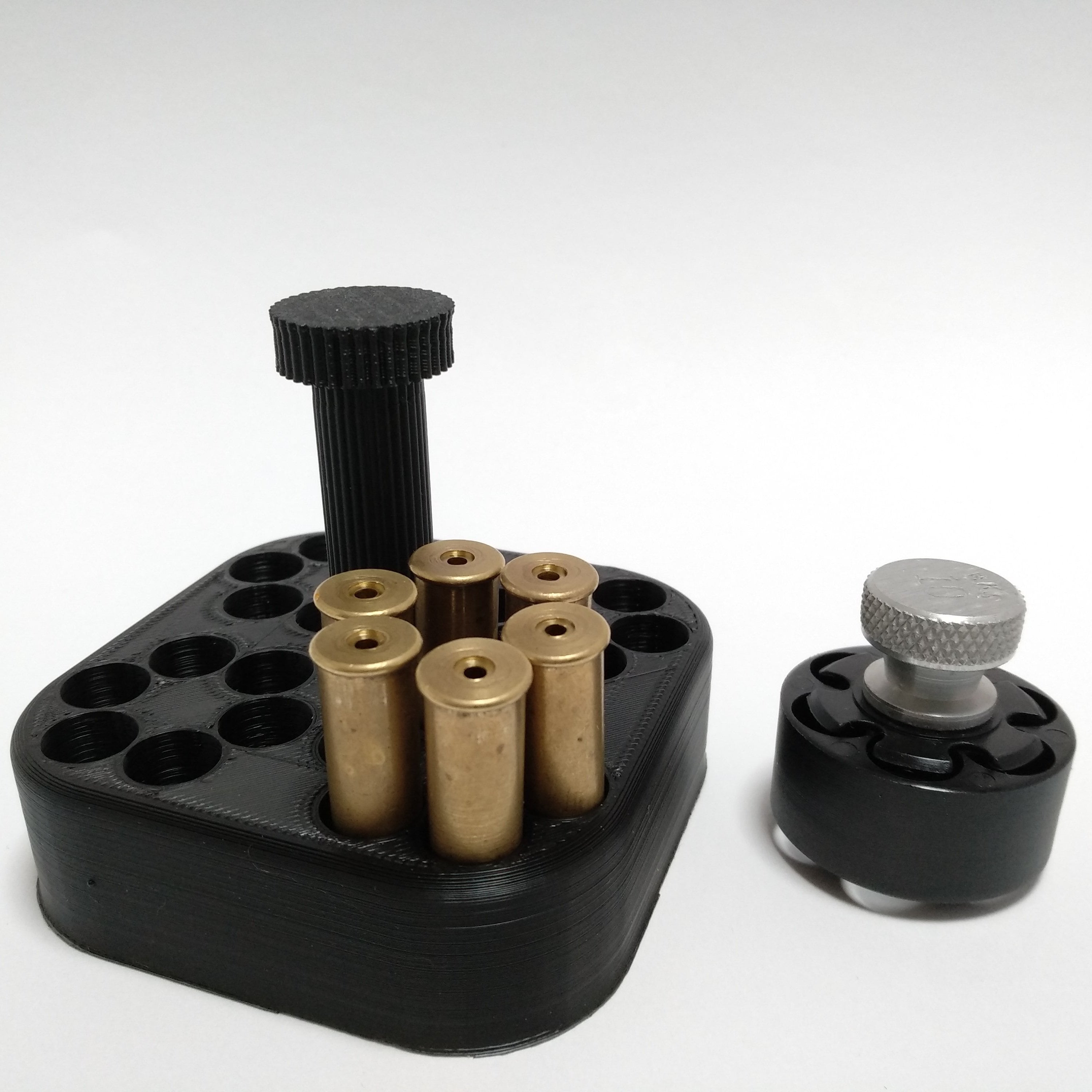 スピードローダー HKS 10-Aを4セット用意しておくことができるローディングブロックです。穴の半径は11mmなので9mmのアキュラシーカートやXカートリッジの.357マグナム、.38スペシャル、45ロングコルト弾など幅11mm以下のカートリッジの整理にも使用できます。